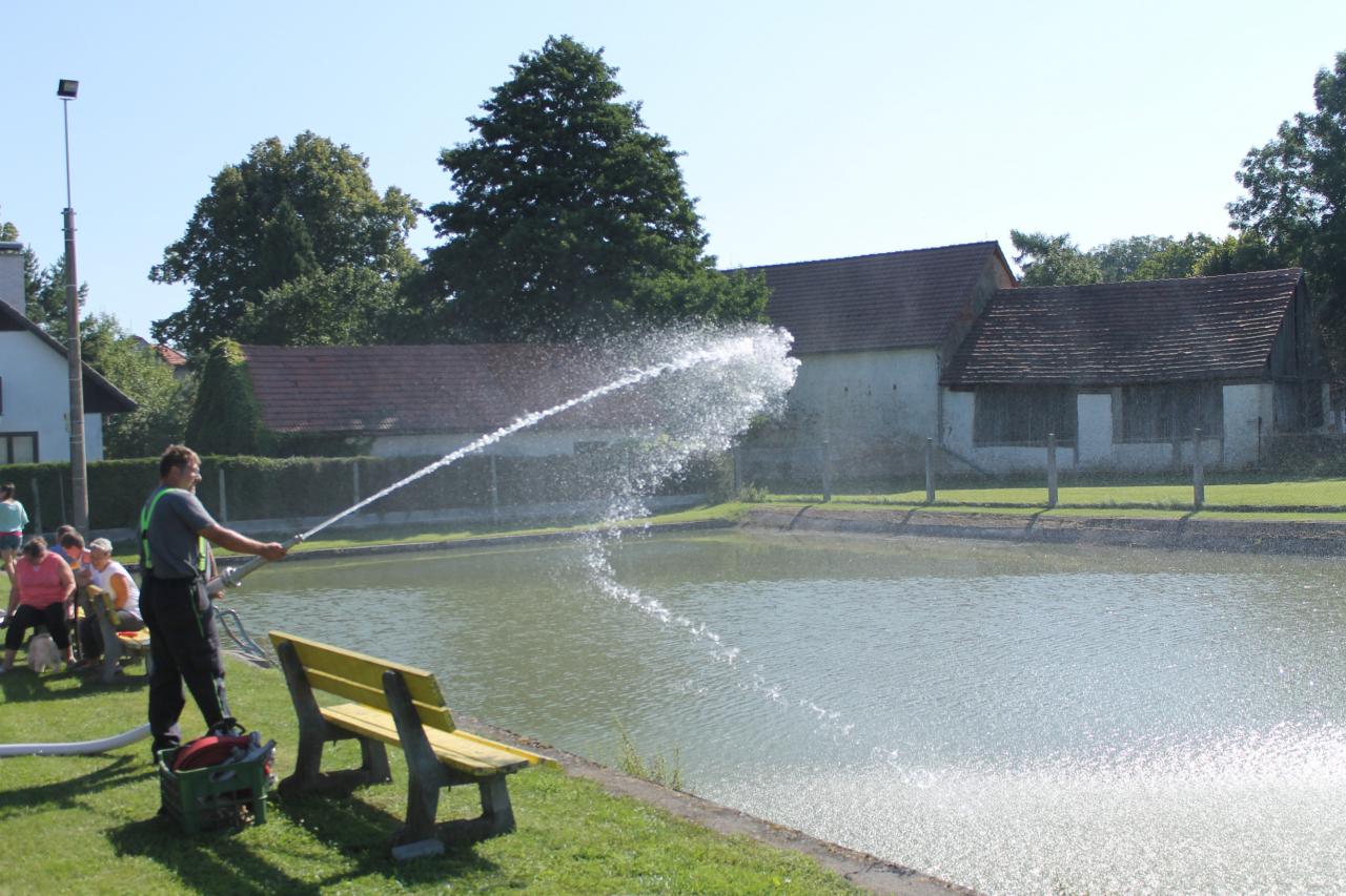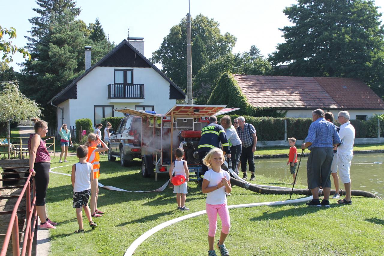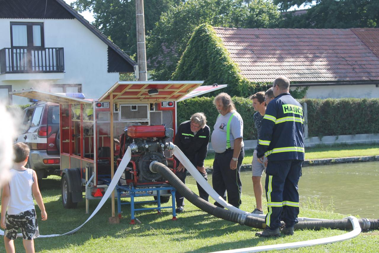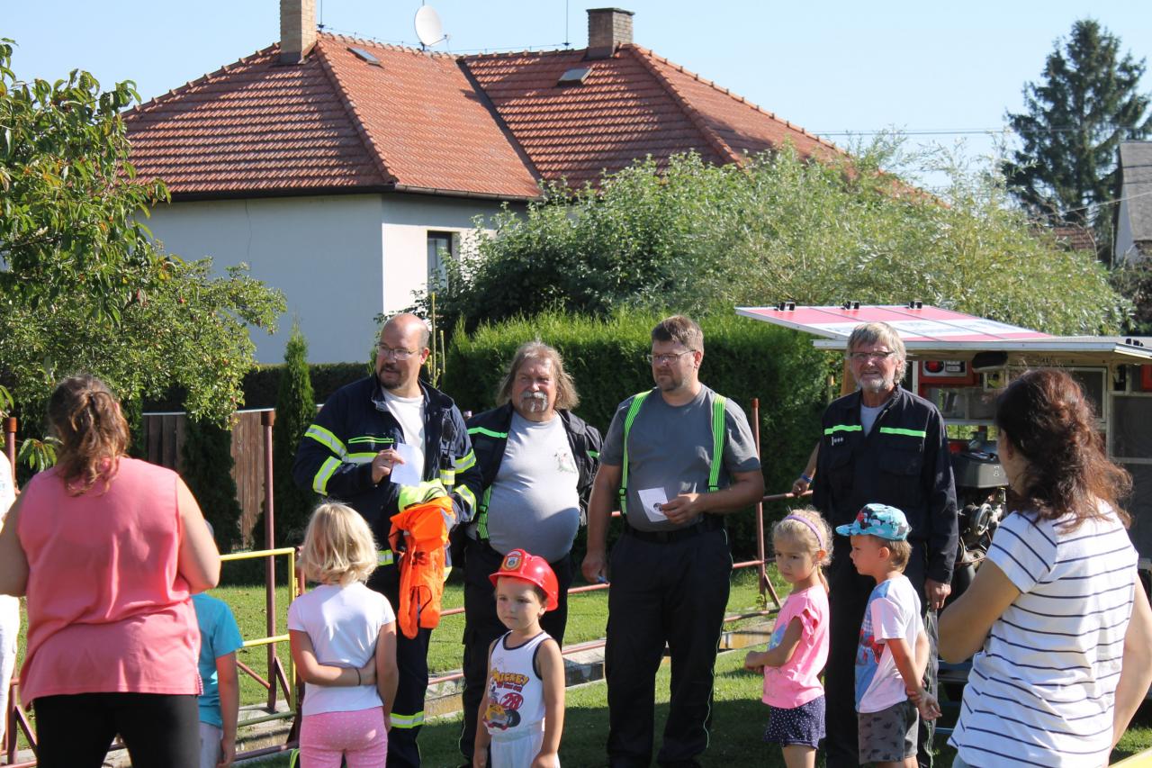 kdy si děti mohly zkusit, jak se hasí oheň - stříkaly hadicí na cíl a byly pro ně připravené různé soutěže. Hasiči zároveň vyzkoušeli funkčnost hasičské stříkačky.